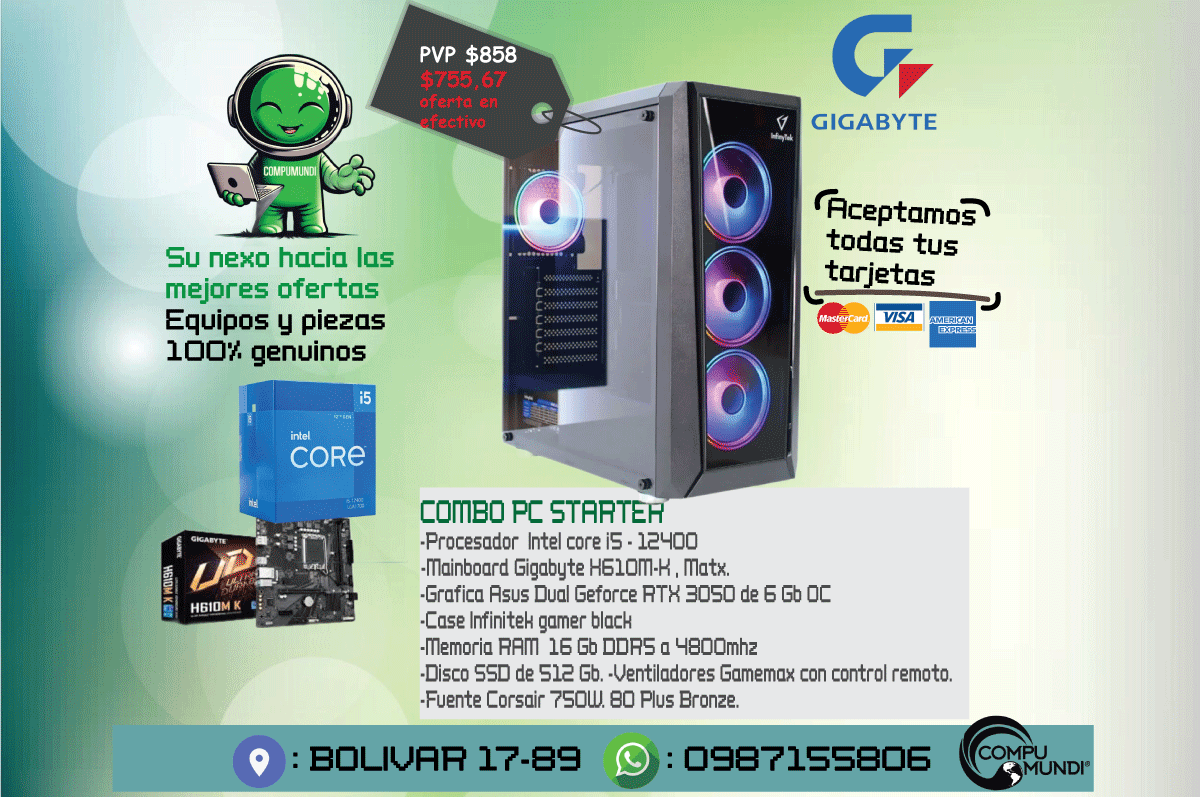 Disponemos ofertas en laptops, equipos todo en uno, PCs gamer, impresoras de tinta contínua, routers para hogar y oficina, cámaras de video, monitores, memorias ram, audífonos, componentes gamer, y más accesorios informáticos para el hogar y la oficina.